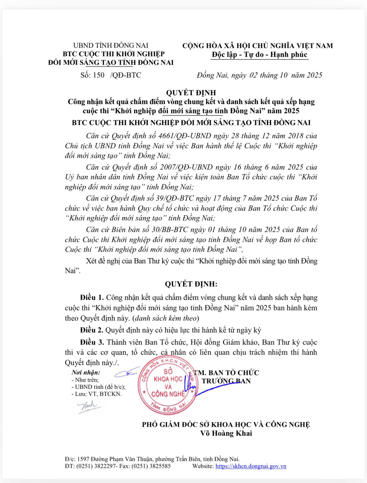 Quyết định công nhận bài thi lọt vào vòng chung kết Cuộc thi Khởi nghiệp đổi mới sáng tạo tỉnh Đồng Nai năm 2020Quyetdinh_congnhan_ketqua_thuthach_2020_gui_thisinh